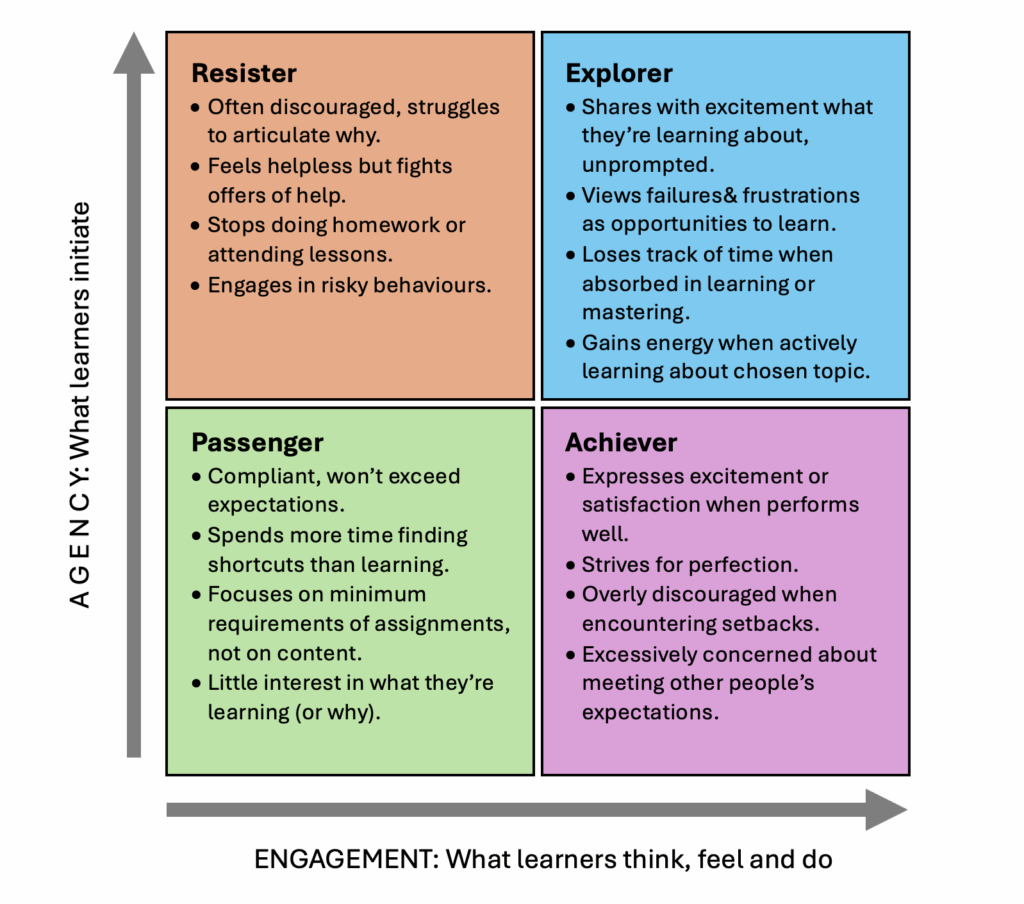 Anderson and Winthrop identify four “modes of engagement” that adolescents can move through in different contexts — in school, outside school, or even between subjects. At Le Rosey, where our students live and learn together, these modes appear vividly — in lessons, on the sports field, on stage, or in the boarding houses. Each mode reveals something about how students balance motivation, agency, and well-being. The image below presents a two-axis model of adolescent engagement from The Disengaged Teen, showing how agency (vertical axis) and engagement (horizontal axis) combine to create four learner “modes”: Passenger, Resister, Achiever and Explorer.